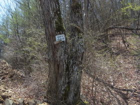 | 嵯峨塩深沢林道出合。ここから嵯峨塩鉱泉に行く道があるが、林道を南に進む。 |