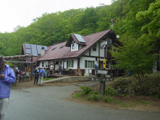| 上日川峠のロッヂ長兵衛。小雨の降る生憎の天気だが付近の駐車場は満杯で、人も多い。 |