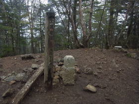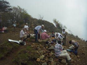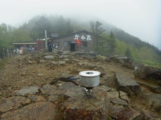 | 介山荘の前のテーブル状の岩を使って、グループ恒例のカップ麺とドリップコーヒーを楽しみました。 霧に包まれ今にも降り出しそうになったり、薄日がさしたりという変わりやすい天気でしたが、降られずにすみました。 のんびりと昼食をとっている間にもそばを通過して行く人は絶えないという状態で、人の多さに驚きました。今にも雨が降り出しそうという天気でこの人出ですから、好天だったらもっと人出が多いのかもしれません。 |
