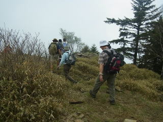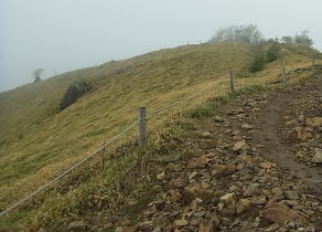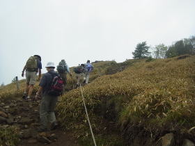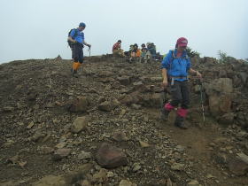 | 雷岩に向う道。相変わらずの人の多さ。踏まれて植物がなくなってしまったためでしょうか登山道の土が流出して岩が露出しているところが多くなったようです。残っている植物は笹が多く、これでは花が咲いていないのはしかたのないことです。 |