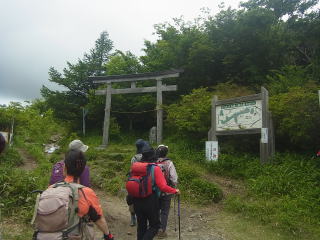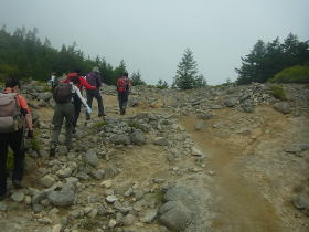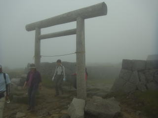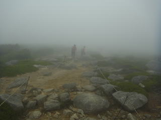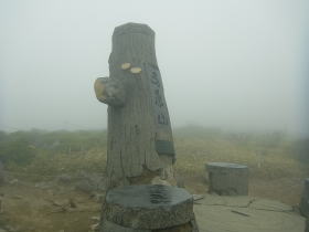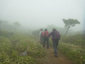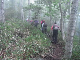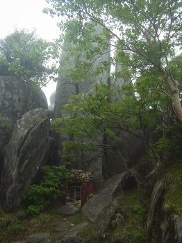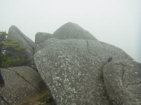 | 雨には降られませんでしたが標高の高いところでは霧が深く、眺望は得られませんでした。花の写真を撮る意欲もわきませんでした。 日枝神社から日出岩にかけては、ほぼ平坦な岩場に潅木が茂り、イソツツジが見られましたので、高山の雰囲気のある開けた場所のようでした。天気さえ良ければ太平洋を望めたかもしれません。 |