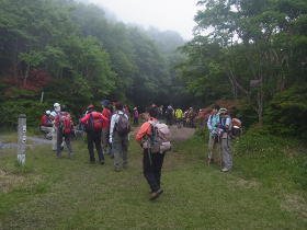 | しゃくなげ荘が近くなると平坦な道に。ガスはだんだんと濃くなって来ました。 |