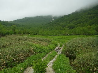| 展望湿原。案内によると白馬岳、杓子岳、鑓ヶ岳が見える場所ですが、ガスって見えませんでした。 |