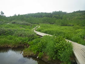 | 展望湿原へは少しばかりの登りはありますが、歩くのが苦手の人でも手軽にお花畑を見られる所です。最近の手軽に見ることができるお花畑は人工的に花を増やしているようすが伺われるものが多いようですが、ここは名前のとおり、木道や山道を除けば人の手の入っていない自然なお花畑のようでした。 |
