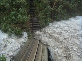 | トイレまで戻った時に連れが携帯がないことに気付き、木道でスリップした時に落としたらしいというので急ぎ足で探しに戻りましたが、20名、30名というツアーのパーティーも多く、追い越したりすれ違ったりするのが大変で思うような速さでは歩けませんでした。 スリップしたところが木道の階段で、ショウジョウバカマを見たところで、ひどく曲がった木があった所だと覚えていたので、見逃さないように注意して進むと、見つかりました。だが携帯は見当たりません。廻りこんで探すと木道の陰にありました。木道を歩く人に見えるように落ちていたら、拾われて届けてくれても受け渡しに時間が掛かってしまいそうなので心配でしたが、偶然に隠れるように落ちていて助かりました。 携帯の回収に40分程かかりましたが、翌日の予定に影響しない範囲なので良かった。 |