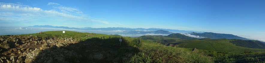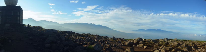 | 前日にリフトで登った時には車山山頂には多くの人がいましたが、今日は車山肩から登りましたが誰もいません。気象レーダーが朝日をうまく遮り、蓼科山から八ヶ岳、南アルプスが見えました。 |