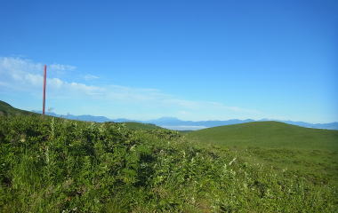 | なだらかな草原の道が多いので、好天に恵まれ遠くの山がいつも見えている状態で歩くことができました。また至る所に花が咲いていて写真を撮るのに忙しいという状態でした。 |
