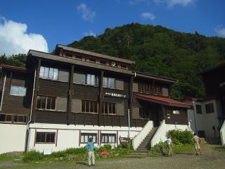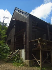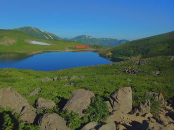 | 白馬大池の畔の白馬大池山荘。背景は雪倉岳と朝日岳。 |