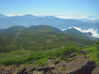 | 天狗ノ庭から見る朝日岳と雪倉岳。前日にあの稜線を歩き、天狗ノ庭との間の谷沿いの鉱山道を下ったのに、なぜかあそこを歩いたという実感がわきませんでした。 |