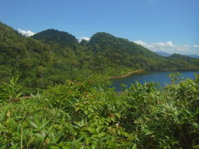 | 風吹大池周遊路から見る風吹大池と背景中央に見える風吹岳 |