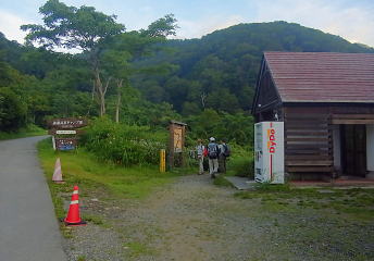 | 雨飾高原キャンプ場下の駐車場前の雨飾山登山口 |