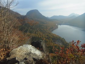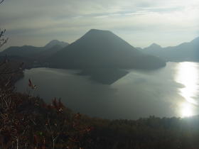 | 硯岩から見る烏帽子ヶ岳(左の写真)と榛名富士(右の写真)。逆光でその上、薄曇りの太陽が湖面で反射して榛名富士の方向はとても見にくかった。 |