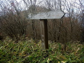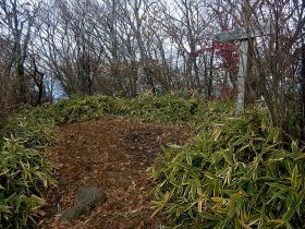 | 岩に赤い矢印があったので進んでみると、すぐに行き止まりになりました。岩の名前を書いたものはありませんでした。戻って、送電線の巡視路でこの岩を巻き杖の神峠に向かいました。 |