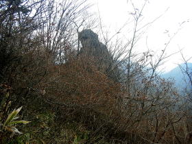 | 杏ヶ岳から杖の神峠近くまで戻ると、掃部ヶ岳から杖の神峠に下るときに巻いた岩らしきものが見えました。 |