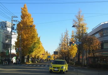 | 高尾駅近くで見た朝日に輝く国道20号の銀杏並木 |