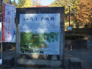 | 八王子城跡公園管理棟前の案内。ここでも背景の紅葉が目立つ。 |