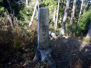 | 杉沢の頭の道標。立木の株で出来ており、残酷な感じも。 |