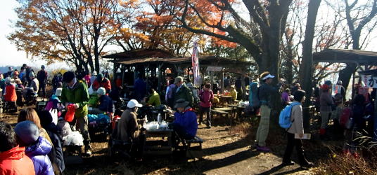 | 景信山の賑わい。トイレの前にも長い行列ができていました。ここではは休まずに通過。 |