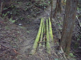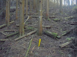 | GPSと書かれた黄色い杭のある所に来ました。間伐をした所のようです。 |