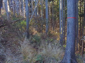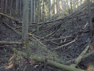 | 杭のある場所から見上げると、間伐をしたところの先に平溝尾根の鞍部らしきものが見え、距離もあまりありません。谷をそのまま進むより楽そうなので鞍部を目指しました。登ってみると見えた鞍部は平溝尾根の稜線でした。歩いたことのある尾根なのでこれで一安心。 |