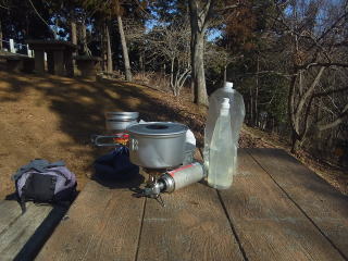 | 草戸山。テーブルを使うことができ、カップ麺とドリップコーヒーのお湯をわかす。 |