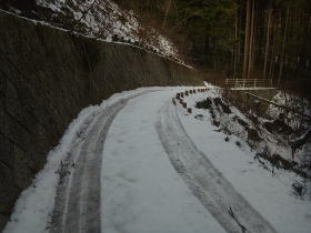 | 八重山に続く道。前々日にふった雪にタイヤのあとはありましたが足跡はありません。 |