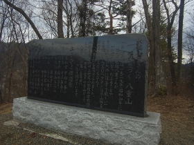 | 展望台近くの峰にある八重山の由来と『ふるさと櫻讃歌』が書かれた石碑。 |