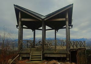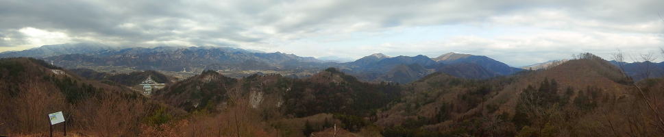 | 展望台からの眺望。丹沢の東の端の焼山から丹沢の山々、道志の山々、さらに権現山、雨降山まで180度を越える眺望です。写真の中央付近には雲の間から富士山もちょっと顔を出していました。 |