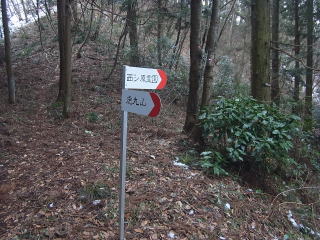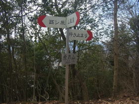 | 虎丸山山頂の道標。登山口の駐車場の方に進みそうな『西シ原』の方に進みました。 |