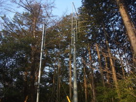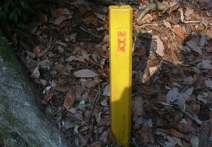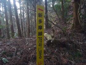 | 取付きからはあまりはっきりしない踏跡でしたが、赤布はたくさんありました。そのうちこのNHKと書かれた杭があり、そのちょっと先には共同受信用らいしアンテナがありました。ここが尾根の最初のピークで、これ以降は、一部を除いてはっきりした踏跡か山道がありました。 |