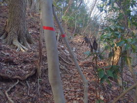 | 空き地を尾根に向かって進むと右側の奥に赤布があり、ここが取付き点でした。 |