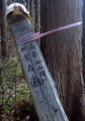 | 高茶山 山頂には山名標ではなく『平成12年 間伐記念』と書かれた杭があり、旧金森山 (本宮山)とも書かれていていろいろな山名で呼ばれていたことが分かります。 |