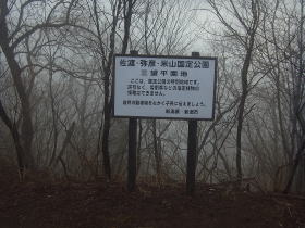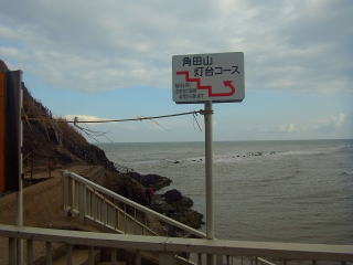 | 角田浜の駐車場には灯台コースの道標があり、灯台に登る階段が見えましたが桜尾根コースの道標は見当たりません。そこでまず下山する予定の桜尾根コース登山口を探しました。 やっと探し当てると『ここは登山道ではありません 私有地です』と書いてあり、スパイク長靴登山禁止とかストックの先端にゴムキャップのないものは使う人は入山するなとも書いてありました。 つまり登山道ではないが、スパイク長靴やゴムキャップのないストックを使わければ登って良いと読める注意書きです。 |