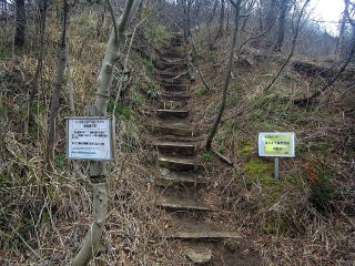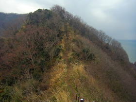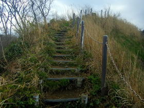 | 山頂に向かう道。登り始めのヤセ尾根の部分には転落防止の鎖があり、急な所は階段になっていました。 |