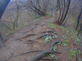 | 前夜からの雨や雪で濡れた土の道の上を多くの人が歩くので、泥々、ヌルヌルの状態で滑りやすく慎重に下山しました。尻餅はつかずにすんだものの、スパッツを着けなかったのでズボンの裾は泥だらけでした。 下山後、弥彦神社に向かいました。朝、角田山に向かう時に見た弥彦山は広い範囲が雪で覆われていましたが、昼近くになってみると白く見えるところは少しだけでした。木に着いていた雪が融けたか落ちたためのようです。朝、見た時には弥彦山に登るのは大変かなと思いましたが、これなら大丈夫そうだと安心しました。 |