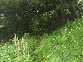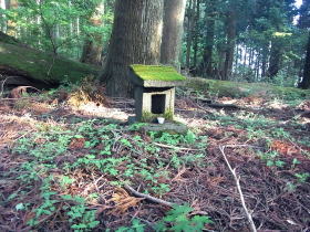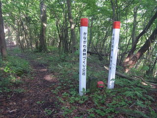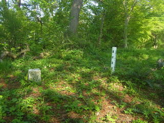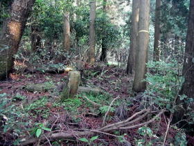 | 押立山らしき所。2本の新しい杭の間に境界標らしい杭と石祠らしいものがありました。 |