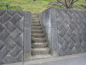 | 洒水ノ滝駐車場の近くにこの階段があり、2.5万図にある山道ではないかと思い、前日にちょっと登ってみると道らしきものがあり、赤布もありました。登れそうな気配ですが、結局林道に出るので林道をたどることにしました。 |