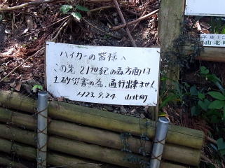 | 洒水ノ滝の二十一世紀の森にむかう林道の入口に土砂災害のため通行できないと書いてあるのは前日に知りました。ちょっと心配しながら鳥手山に向かいましたが、二十一世紀の森からあまり使われていそうもないルートを下ったためでしょうか、土砂災害の現場らしき所は通りませんでした。 |