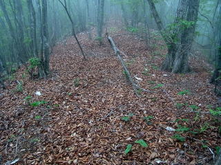 | 居鞍岳に向う道。落ち葉に埋もれて踏跡は見いだせません。 |