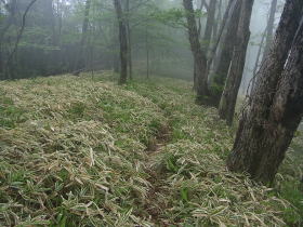 | 居鞍岳から掃部ヶ岳に向かう道はこのような笹の所が多く、はっきりとしていました。 |