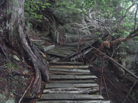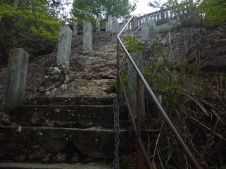 | 山頂直下の急な石段と鎖場 |