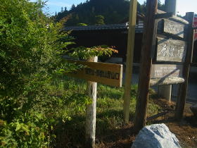 | バス停付近を探すと登山口への道標がありました。枝が伸びて隠され、車からは見にくくなっていました。 |