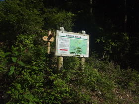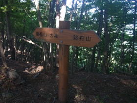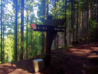 | 林道をかすめたところの道標。登山口から急な道で、林道をかすめ、祠のある峰まで急な道が続きました。 |