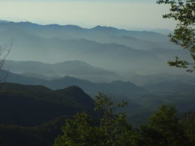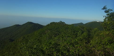| 木製や鉄製の階段のある道を辿り稜線に出ると東側の山並みが見えました。 |