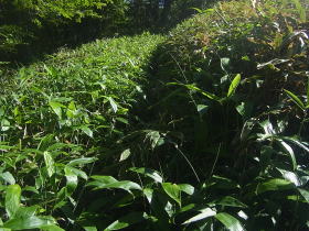 | 五輪峠登山口付近はは笹で覆われていました。数メートル歩くだけでひざ下はびっしょりに。 |