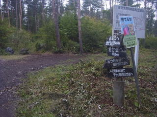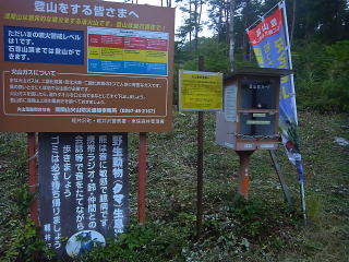 | 追分登山口。登山者カード入れのほか、道標、登山コース案内図、注意書きなどがありました。 |