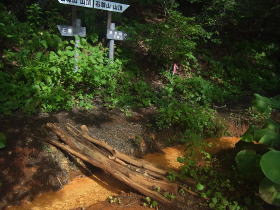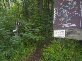 | 血の池近くの石尊山に行く二つの登山道の分岐。右の源泉を経由する道を進みました。 |