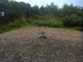 | 直方体のあるところから西峰の方に進み、西峰に行く道を探しましたが見当たりませんでした。ちょっと藪漕ぎをすれば西峰に行けそうでしたが、藪が濡れていたのでやめて、山頂近くに一旦戻って直接東峰、西峰の分岐に戻りました。 |