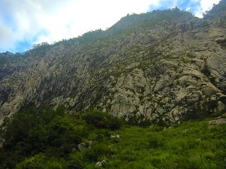 | 登山道が岩壁から落ちた岩の堆積したガレ場をたどるようになると岩壁が間近に見えます。 |