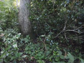 | 崩落地点の立木の沢側には赤い丸のマークがありここが登山道であることは確認できました。このような蜜藪だったので迂回するのも諦め引き返しました。 |